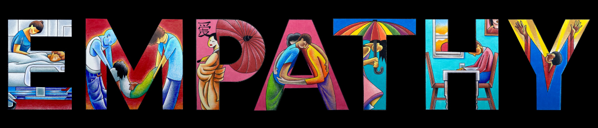 At first glance, I want the viewer to be drawn to the colors, but after closer inspection the images inside each letter begin to create stories where empathy is desired. The “E” represents the sick, the families and hospital workers who have been so present throughout this past year. “M” represents the struggles of the intercity by gun violence in any form. “P” represents the violence against the Asian community (The Chinese lettering means love). “A” shows that everyone need a hug sometime. The “T” represents inclusion and the LGBTQ community. The “H” shows the loneliness of loss, and the “Y” stands for faith and hope through our beliefs.